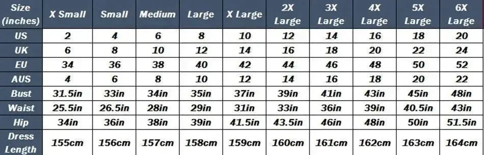 Size US UK EU AUS Bust (in) Waist (in) Hip (in) Dress Length (cm)