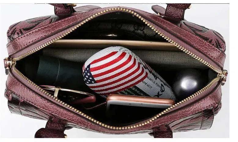 Bring an air of sophistication to any outfit with this eye-catching Embossed Leather Handbag! Made of quality PU leather and detailed with a stunning embossed floral pattern, this handbag is fashionably chic with padded handles and a secure top zipper closure. Make a bold statement and elevate your style!
