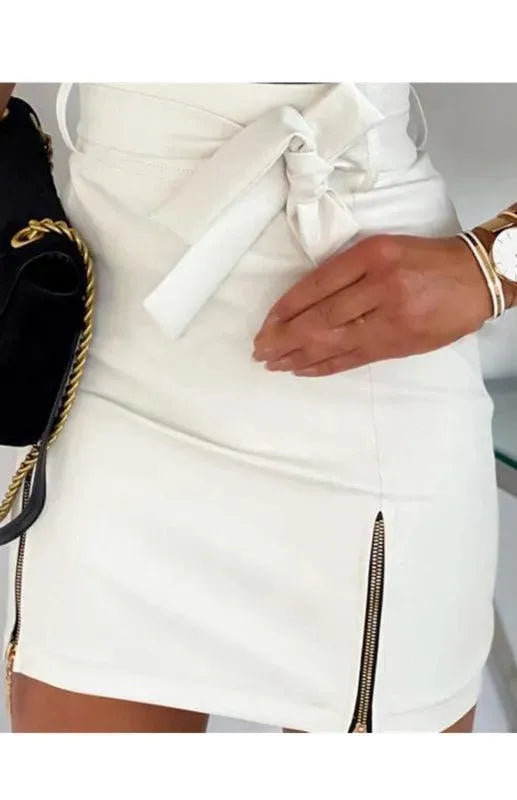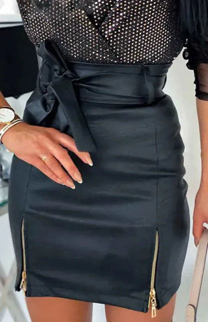 Ladies Belted Hem Zip Mini Skirt With Zipper Slit