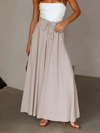 solid and polyester-cotton blend form a flawless canvas of casual luxury. The drawstring closure, plain hem, and wide leg detail elevate everyday wear into timeless style.