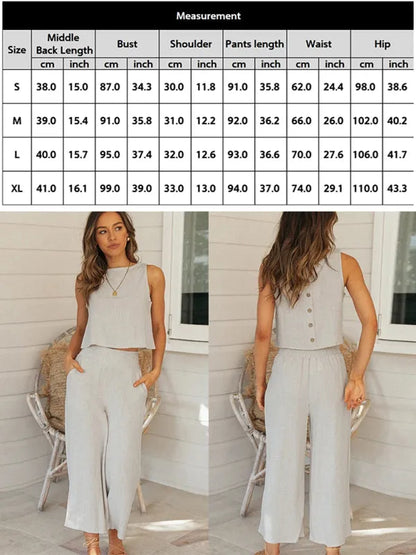 This outfit showcases a clean, solid pattern, paired with a collarless neckline and airy wide-leg pants that emphasize its relaxed character. The sleeveless cut adds breathability, while the polyester knit composition ensures long-lasting comfort and shape retention. With its casual mood and easy-to-style neutral tone, this matching set for women is the go-to choice for laid-back occasions.