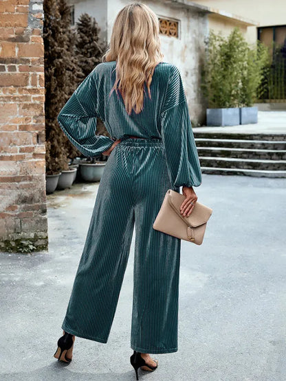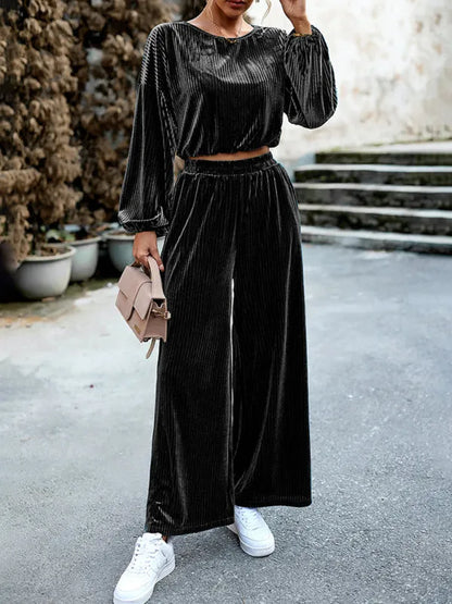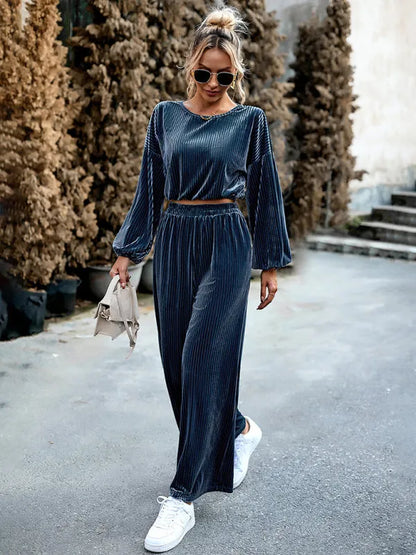 The top features a classic crewneck and long sleeves, while the bottom offers flattering wide-leg pants enhanced by an elastic waist. The striped detail adds modern flair, complemented by a relaxed fit and woven finish that is light enough for in-between-season layering.